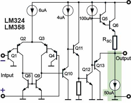 Bardzo ważnym, a wręcz przełomowym momentem było opracowanie w National Semiconductor (Russell, Frederiksen) wzmacniacza operacyjnego „przemysłowego”, który też mógł być zasilany niskim pojedynczym napięciem. Był to opracowany w roku 1972 wzmacniacz LM124 i jego popularniejsza wersja LM324. Kostka ta zawierała cztery jednakowe wzmacniacze w jednej obudowie DIP-14. Rysunek 5 pokazuje schemat wewnętrzny jednego wzmacniacza.