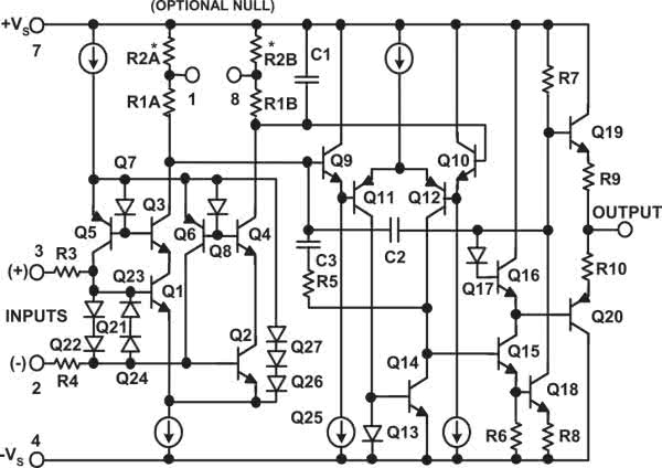 Wracając do historii, trzeba przypomnieć, że w roku 1975 w firmie PMI (Precision Monolitics, obecnie Analog Devices) opracowano wzmacniacz OP07 (rysunek 6), który stał się klasykiem i punktem odniesienia dla wzmacniaczy precyzyjnych. Dobre parametry wejścia uzyskano dzięki kompensacji prądów wejściowych (kompensacji prądów baz) wejściowych tranzystorów bipolarnych oraz korekcji napięcia niezrównoważenia podczas produkcji przez tzw. „zener-zapping”. Napięcie niezrównoważenia zredukowano poniżej 0,1 mV i dryft do wartości 1 μV/°C, a nawet mniejszej. W kartach katalogowych wzmacniaczy precyzyjnych oprócz tych dwóch parametrów podaje się też stabilność długoczasową offsetu, wyrażaną zwykle w mikrowoltach na miesiąc (μV/month).