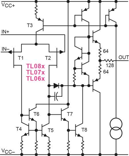 Także w roku 1974 powstały w RCA, mające na wejściach tranzystory MOSFET P, wzmacniacze CA3130, zawierające w strukturze także tranzystory bipolarne. Natomiast w roku 1978 powstały w Texas Instruments bardzo znane i do dziś popularne kostki TL081/082/084 oraz wersje niskoszumowe TL07x i energooszczędne TL06x, wszystkie z tranzystorami JFET P na wejściach – o schemacie pokazanym na rysunku 7.