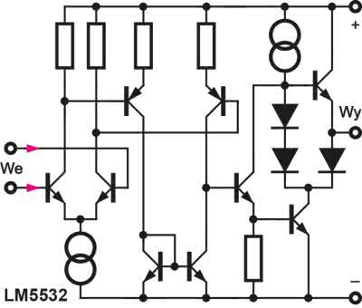 Istotnie, ale niestety nie jest to przykład łamania dominacji USA w dziedzinie wzmacniaczy operacyjnych. Wzmacniacz ten pierwotnie też został opracowany za oceanem przez amerykańską firmę (czy może raczej biuro projektowe) Signetics, która stała się częścią Philipsa, choć dość długo zachowywano markę Signetics. Ściślej biorąc, najpierw powstał pojedynczy wzmacniacz NE5534, który mógł stabilnie pracować przy wzmocnieniu większym niż 3×. Potem zaproponowano jego podwójną wersję NE5533, po której dziś trudno znaleźć ślad. Nieprawdopodobnym przebojem okazała się kostka NE5532, czyli podwójna wersja z wewnętrzną kompensacją, mogąca pracować także przy wzmocnieniu równym jedności. Jej mocno uproszczony schemat pokazany jest na rysunku 8. Spośród starszych wzmacniaczy operacyjnych dość chętnie stosowanych w lepszym sprzęcie audio były też opracowane w roku 1980 precyzyjne i niskoszumowe OP27 i OP37.