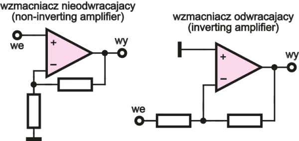 Opisywane dotąd układy były klasycznymi wzmacniaczami operacyjnymi, oznaczanymi VFA (Voltage Feedback Amplifier), czyli z napięciowym sprzężeniem zwrotnym. Dwa najbardziej popularne, podstawowe układy pracy pokazano na rysunku 9.
