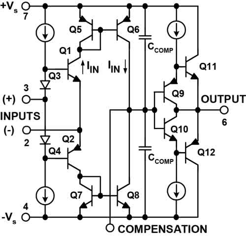 Wracamy do pierwszych wzmacniaczy operacyjnych. Były one zbudowane z tranzystorów bipolarnych. Z uwagi na obecność tranzystorów bipolarnych w wejściowej parze różnicowej prądy wejściowe były stosunkowo duże. Tymczasem w licznych zastosowaniach źródło sygnału ma ogromną rezystancję wewnętrzną i współpracujący wzmacniacz musi mieć jak największą rezystancję wejściową i jak najmniejszy prąd polaryzacji. We wspomnianych precyzyjnych, bipolarnych OP-07 i pokrewnych dla zmniejszenia prądu baz zastosowano sprytny obwód kompensacji, co dało dużą, ale nie zawsze wystarczającą poprawę. Już w późnych latach 60. podejmowano próby zastosowania na wejściu pary tranzystorów polowych, co pozwoliłoby wielokrotnie zredukować prądy polaryzujące. Problemem były różnice parametrów egzemplarzy tranzystorów polowych, także gdy wykonane były obok siebie na jednej płytce krzemowej. Od roku 1970 próbowano do „zwykłych” wzmacniaczy operacyjnych dodawać wejściową parę różnicową w postaci oddzielnej, drugiej struktury krzemowej (np. AD503, AD506), przez co taki wzmacniacz operacyjny miał wewnątrz obudowy dwie oddzielne struktury scalone. Próbowano także realizować wejściowe tranzystory polowe w jednej strukturze z resztą tranzystorów bipolarnych (μA740, ICL8006). W każdym przypadku podstawowym problemem było duże napięcie niezrównoważenia, nawet kilkanaście mV i jego duży dryft, do kilkudziesięciu μV/°C (a ponadto duże szumy „napięciowe”).