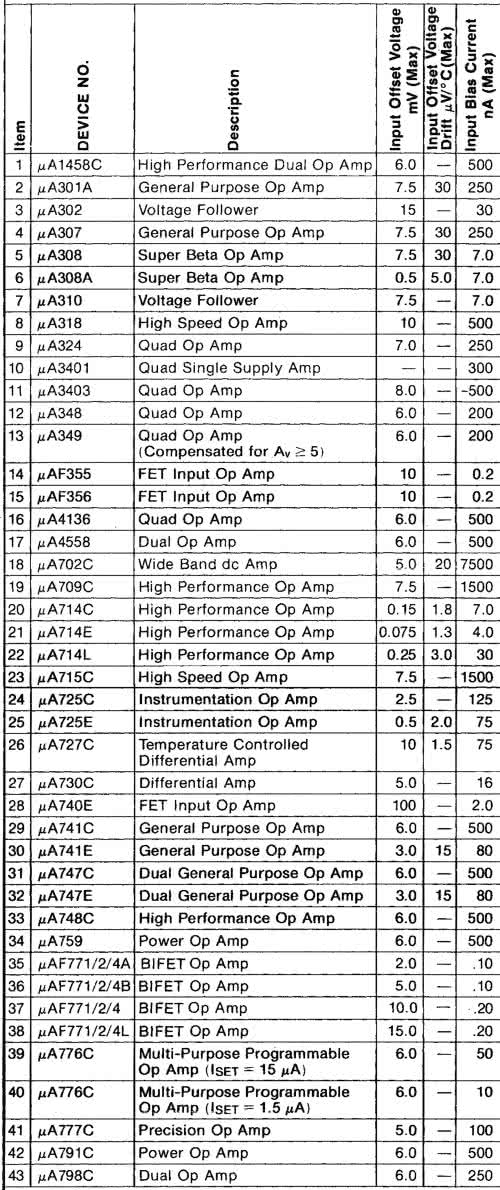 W USA monolityczne wzmacniacze operacyjne zaczęły się upowszechniać od końca lat 60., poczynając od μA709. Rysunek 11 pokazuje fragment katalogu Fairchilda z 1979 roku. Na liście mamy prawie pięćdziesiąt wzmacniaczy do wyboru! Nie sposób przedstawić, ile wzmacniaczy o naprawdę zadziwiających parametrach było dostępnych na świecie dziesięć lat później, pod koniec lat 80.