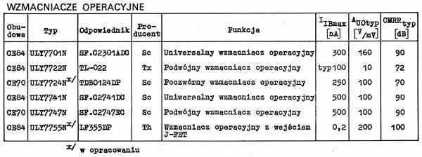 Jedną z najważniejszych ilustracji w tym artykule jest rysunek 12, pokazujący wykaz wzmacniaczy operacyjnych produkowanych i planowanych do produkcji przez UNITRA CEMI w latach 1988/1989, czyli dziesięć lat później, niż pokazuje katalog z rysunku 11. Mamy w istocie tylko cztery pozycje, ponieważ dwie są jeszcze niedostępne – „w opracowaniu”!