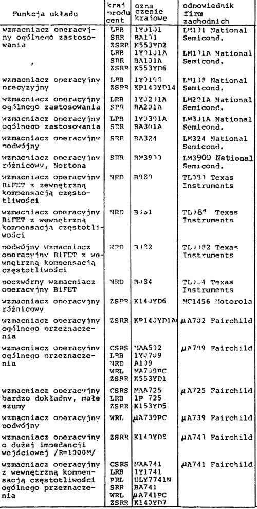 Komentarz chyba jest zbędny. Dla nakreślenia odrobinę pełniejszego obrazu sytuacji należy dodać, że już wcześniej w innych krajach obozu komunistycznego były produkowane odpowiedniki niektórych wspomnianych wzmacniaczy operacyjnych. I tak czechosłowacka TESLA produkowała wzmacniacze MAA501, MAA502 i MAA504, które były lepszymi lub (według powszechnej opinii) gorszymi odpowiednikami μA709. Trzeba przyznać, że te „czeskie” kostki, choć nie cieszyły się dobrą oceną, były dostępne na polskim rynku, także dla hobbystów. Rysunek 13 pokazuje fragment znacznie wcześniejszego Biuletynu Techniczno-Informacyjnego z 1983 roku. Dowiadujemy się zeń, że w krajach RWPG produkowano wtedy też inne wzmacniacze operacyjne. I tak w NRD wytwarzano m.in. odpowiedniki kostek TL081/082/084. Ze zdziwieniem dowiadujemy się, że stosunkowo dużo wzmacniaczy operacyjnych produkowano w Bułgarii (LRB) i Rumunii (SRR). Być może wykorzystywane były w Polsce w niektórych strategicznych zakładach produkcyjnych, ale ówczesny polski elektronik nie miał z nimi do czynienia.