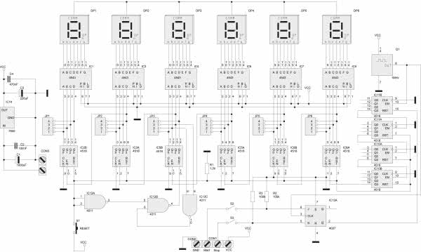 Schemat elektryczny bloku głównego stopera z EP 8/1998 pokazano na rysunku 1. Na pierwszy rzut oka wydaje się on skomplikowany, ale na pewno zauważymy, że na jego złożoność wpływa nie tyle układ połączeń, ile liczba elementów sterujących pojedynczym wyświetlaczem, których jest 6 – bloki muszą być powielone. Każdy wyświetlacz wymaga do sterowania aż 1,5 układu scalonego – połowę licznika 4518 i cały dekoder 4543, co przy 6 wyświetlaczach daje 9 układów. Jeśli dodamy do tego dzielnik wstępny zawierający 2 układy, przerzutnik start/stop z 1 układem, bramki dekodujące „6” zawarte w 1 układzie scalonym, stabilizator napięcia oraz generator 1 MHz (co prawda to moduł, ale potraktujmy go jak 1 układ), to daje zawrotną liczbę aż 15 układów scalonych do realizowania stosunkowo nieskomplikowanej funkcji pomiaru czasu.