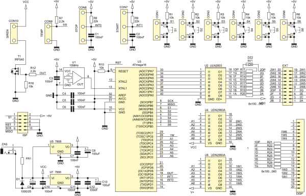 Projekt następcy kitu AVT447 opisaliśmy 14 lat później – był to „Mega stoper”, oferowany jako zestaw AVT5377. Schemat ideowy płytki głównej „Mega stopera” pokazano na rysunku 2. Oczywiście, w międzyczasie były publikowane opisy innych urządzeń, ale ten jest najbardziej zbliżony funkcjonalnie. Jeśli być konsekwentnym i liczyć moduł generatora zegarowego jako jeden układ scalony, to „Mega stoper” zbudowano w oparciu o 7 układów scalonych, z czego 2 pracują w zasilaczu, a 3 to wzmacniacze prądu wyświetlacza, których nie było w poprzedniej wersji. Jeśli odliczyć generator zegarowy, to za całą, znacznie bardziej rozbudowaną niż przed 14 laty funkcjonalność stopera odpowiada pojedynczy układ scalony, ale współcześnie, gdy niektórym konstruktorom łatwiej buduje się chociażby generator akustyczny w oparciu o procesor niż o elementy dyskretne, raczej nikogo to nie zdziwi. Funkcje realizowane przez „Mega stoper” są następujące: