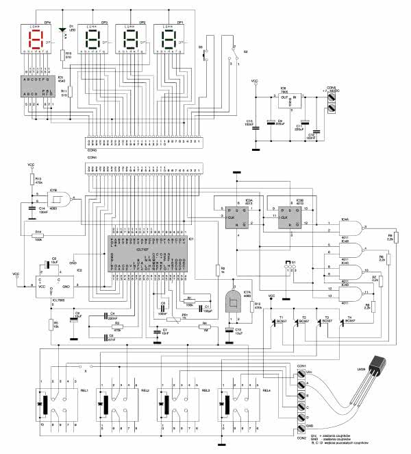 Zastosowany sensor LM35 w podstawowej konfiguracji nadaje się jedynie do pomiaru temperatury większej od 0°C. W termometrze zastosowano więc „chwyt” zalecany także przez producenta (w tamtych latach była nim firma National Semiconductor): dodatkowe spolaryzowanie wyjścia układu napięciem ujemnym za pośrednictwem rezystora (tu R5). Blok przełączania kanałów pomiarowych zbudowano w oparciu licznik 2-bitowy z dwóch przerzutników D (IC3A, IC3B), dekodera 1 z 4 wykonanego z bramek NAND (IC4A…IC4D), tranzystorów BC557 zasilających cewki przekaźników (T1…T4) i z 4 przekaźników miniaturowych (REL1…REL4). Oprócz przełącznika kanałów pomiarowych, licznik steruje też dekoderem kodu BCD na kod wyświetlacza 7-segmentowego (IC5) zapewniając wyświetlanie numeru aktualnie aktywnego kanału pomiarowego (liczba z zakresu 0..3).