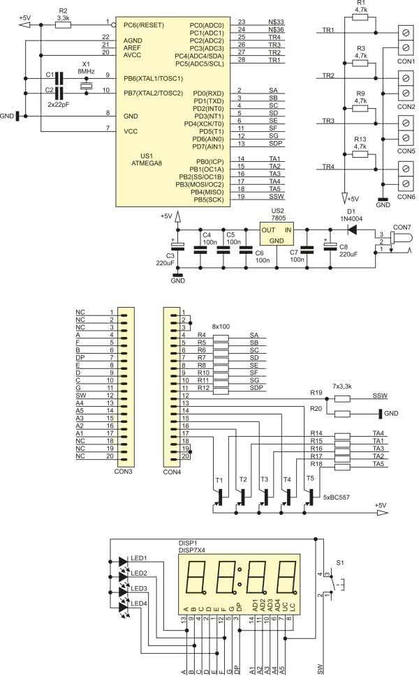 Nowy termometr, AVT5389 z rys. 2, jest w pełni cyfrowy, a jego pracą steruje – niedostępny w tamtych latach – mikrokontroler ATmega8. Przebieg taktujący rdzeń mikrokontrolera jest generowany przy użyciu rezonatora kwarcowego 8 MHz. Wyświetlacz termometru ma 4 cyfry i jest sterowany w trybie multipleksowanym. Anody wyświetlaczy i diod LED są zasilane za pomocą tranzystorów-kluczy T1...T5. Katody są sterowane z portu mikrokontrolera poprzez rezystory ograniczające prąd R4…R12. Termometr współpracuje z czujnikami temperatury DS1820 dołączanymi za pomocą złącz CON1, CON2, CON5, CON6. Podobnie jak poprzednio, termometr ma możliwość automatycznego lub ręcznego przełączania kanałów pomiarowych za pomocą przycisku S1. Jego krótkie przyciśnięcie powoduje przełączenie na kolejny i zaświecenie odpowiedniej diody sygnalizującej wybór. Po wyczerpaniu się możliwości wyboru, przy piątym naciśnięciu przycisku, włącza się automatyczny tryb pomiaru. Jego wybór jest sygnalizowany krótkim zaświeceniem się wszystkich diod. W tym trybie kolejne kanały pomiarowe są aktywowane automatycznie, jeden po drugim, a zmiana następuje co około 3 sekundy. Przełączanie kanałów nie wymaga przekaźnika – jego funkcję pełnią linie I/O mikrokontrolera, który po prostu komunikuje się z wybranym sensorem (kanałem).