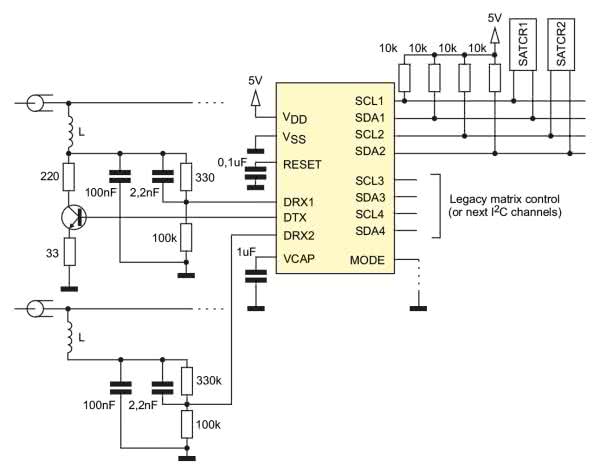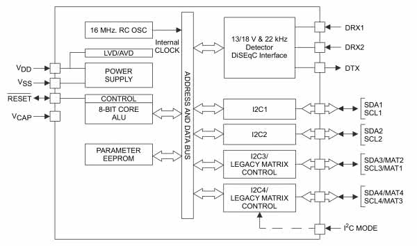 Mikrokontroler STM8SPLNB1 z rodziny STM8S jest konstrukcyjnie zoptymalizowany do stosowania w odbiorczych systemach satelitarnych wyposażonych w konwertery zgodne ze standardem DiSEqC. Wewnętrzna budowa STM8SPLNB1 jest mało mikrokontrolerowa (rysunek 2) przede wszystkim ze względu na brak wewnętrznych uniwersalnych timerów czy interfejsów komunikacyjnych, poza widocznymi na schemacie blokowym 4 kanałami I2C oraz sprzętowym transcieverem DiSEqC. Interfejsy te służą do konwersji protokołów komunikacyjnych pomiędzy konwerterami satelitarnymi i routerami w systemach odbiorczych.