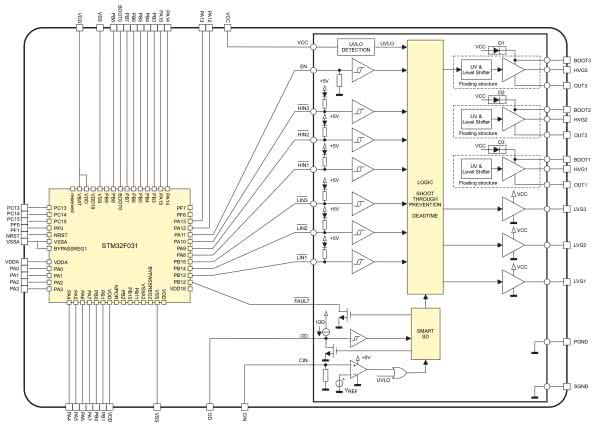 Schemat blokowy układu STSPIN32F060x pokazano na rysunku 4.