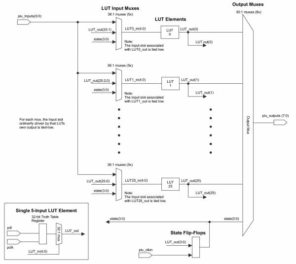 Kilku producentów mikrokontrolerów dostrzegło konieczność wyposażenia produkowanych mikrokontrolerów w bloki logiki konfigurowalnej, która pozwala w prosty sposób optymalizować pracę mikrokontrolera lub jego interfejsów do specyfiki aplikacji. Przykładem tak wyposażonych mikrokontrolerów jest rodzina LPC55S6X firmy NXP, którą wyposażono w konfigurowalny moduł PLU (Programmable Logic Unit), którego schemat blokowy pokazano na rysunku 5. Budowa tego modułu odpowiada architekturze CPLD bazującej na tablicach LUT z 6 wejściami.