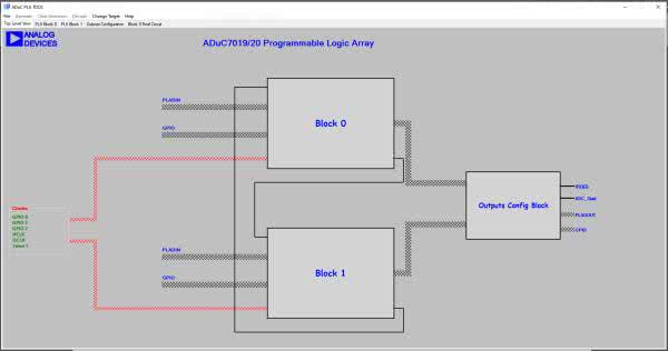 Podobne rozwiązanie oferuje konstruktorom firma Analog Devices w wybranych modelach mikrokontrolerów ADuC701x/702x/712x, które wyposażono w moduły PLA (Programmable Logic Array) o konstrukcji także podobnej do CPLD o 16 komórkach konfigurowalnych. Do konfiguracji bloku PLA producent zaleca używanie programu narzędziowego ADuC PLA Tool (rysunek 6), za pomocą którego można wygenerować plik w języku C, zawierający opis wartości odpowiednich rejestrów mikrokontrolera.