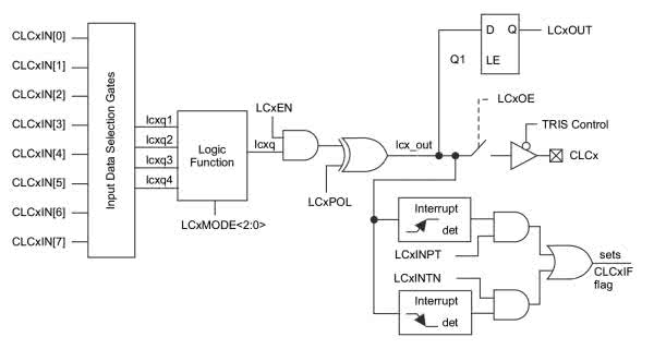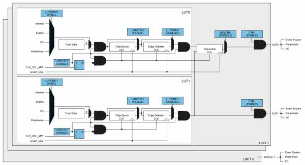 Podobne rozwiązania, ale nazwane CCL (Configurable Custom Logic), firma Microchip zastosowała w rodzinach mikrokontrolerów: ATmega4809, AML10/11/21/22, SAMD5x oraz SAME5x. Uproszczony schemat blokowy podsystemu CCL firmy Microchip pokazano na rysunku 8.