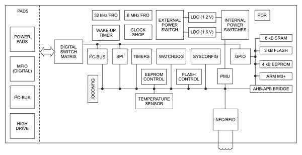 LPC8N04 należy do produkowanej przez NXP rodziny małych układów z rdzeniem Cortex-M0 o nazwie LPC800. Układ LPC8N04 wyposażono w zintegrowany tag NFC (zgodny z ISO14443 type A), który jest dołączony do wewnętrznej magistrali systemowej (rysunek 9). Do mikrokontrolera wystarczy dołączyć antenę NFC i można korzystać (oczywiście po napisaniu odpowiedniego oprogramowania) z zalet tego interfejsu.