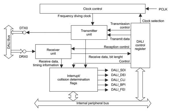 Rodzina mikrokontrolerów Synergy S128 (Cortex-M0+) firmy Renesas została - jako jedna z niewielu na rynku - wyposażona w sprzętowy interfejs DALI (Digital Addressable Lighting Interface) zgodny ze standardem IEC 62386 version 2. Schemat blokowy tego interfejsu pokazano na rysunku 11, jak można zauważyć realizuje on znaczną część protokołu komunikacyjnego DALI.