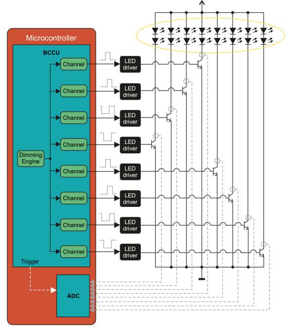 Z myślą o wygodnym sterowaniu LED-ami w aplikacjach sygnalizacyjnych i oświetleniowych firma Infineon wyposażyła wybrane mikrokontrolery z rodziny XMC1000 (XMC1200, XMC1202, XMC1302, XMC1402 oraz XMC1404) w moduły BCCU (Brightness and Color Control Unit), które pozwalają m.in. na inteligentne sterowanie kolorem emitowanym przez LED-y RGB i RGBW. Interfejs BCCM obsługuje do 8 kanałów LED jednocześnie (rysunek 12), każdy kanał może automatycznie sprzętowo obsługiwać rozmywanie stromych zboczy pomiędzy kolejnymi dyskretnymi stopniami jasności LED (rysunek 13), zwiększając liniowość regulacji jasności świecenia odbieranej przez ludzkie oko.