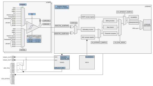 Na bardzo interesujący pomysł wpadli inżynierowie firmy Silicon Labs: mikrokontrolery z rodziny EFM32GG11 wyposażyli w konfigurowalny interfejs LESENSE (Low Energy Sensor Interface) - rysunek 14), który może automatycznie monitorować 16 kanałów z dołączonymi czujnikami (pojemnościowymi, rezystancyjnymi, LC, cyfrowymi). Moduł LESENSE, po wykryciu zadanego wcześniej wzorca budzi CPU z trybu oszczędzania energii, co umożliwia programowe obsłużenie wykrytego zdarzenia. Wzorzec wybudzający CPU może składać się z sekwencji zdefiniowanych wartości, jego poprawność jest wykrywana przez dekoder zintegrowany w LESENSE bez udziału CPU. Prezentowany moduł jest natywnym opracowaniem firmy Silicon Labs, która specjalizuje się w ograniczaniu poboru energii przez produkowane przez siebie mikrokontrolery.