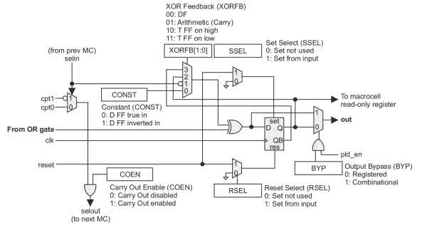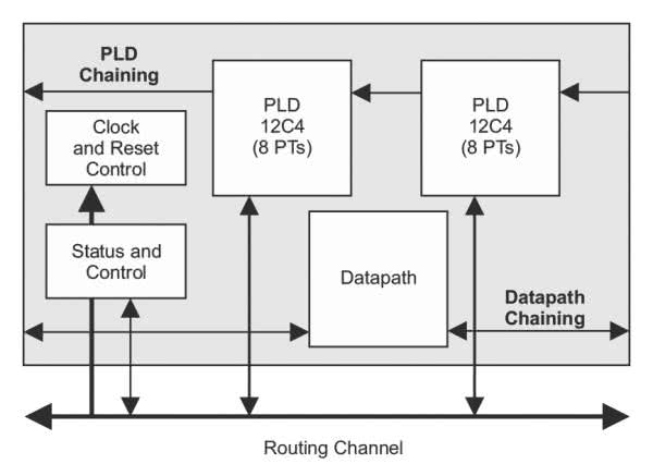 W najnowszej rodzinie mikrokontrolerów PSoC 6 zaimplementowano 12 bloków UDB (Universal Digital Blocks - budowę pokazano na rysunku 15), składających się z komórek PLD, której schemat pokazano na rysunku 16. Budowa jest bardzo bliska klasycznym rozwiązaniom stosowanym w układach CPLD.