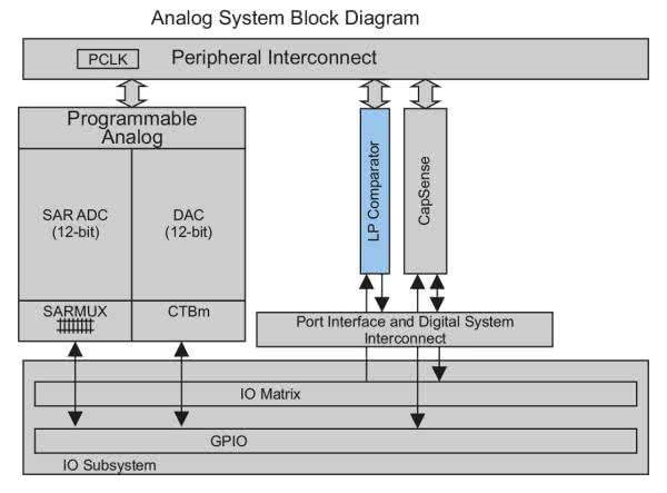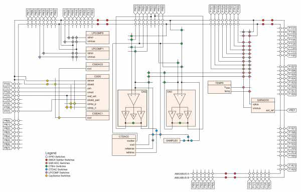 Na rysunku 18 pokazano schemat ilustrujący budowę toru trasującego drogę sygnałów analogowych wewnątrz mikrokontrolera oraz możliwości doprowadzenia go do/z pinów układów. Podobne rozwiązania firma Cypress udostępnia w mikrokontrolerach z rodzin PSoC 4, PSoC 5LP, a także nadal produkowanych PSoC 1 (M8C) i PSoC 3 (rdzeń 8051). Konfiguracja bloków peryferyjnych jest możliwa przy użyciu dostępnego bezpłatnie środowiska programistycznego PSoC Creator oraz PSoC Designer (dla starszych typów mikrokontrolerów).