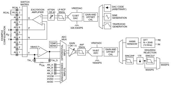 - ADuCM350, który ma wbudowany zaawansowany analogowy interfejs wejściowy z systemem kondycjonowania sygnału analogowego (rysunek 20), a powstał z myślą o budowie liczników mediów, w czym pomaga mu zintegrowany interfejs LCD,