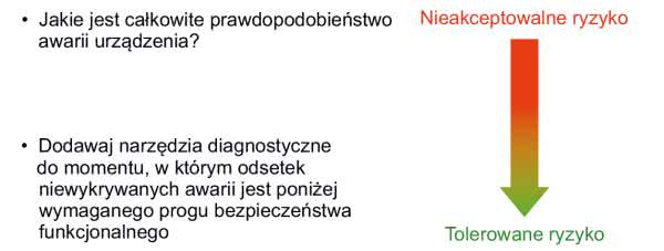 We wcześniejszej części tego artykułu opisaliśmy awarie przypadkowe i metody zarządzania nimi. Konieczne jest teraz zbadanie zagrożeń i ocena ryzyka na poziomie gotowego urządzenia, wykorzystującego programowalne elementy, aby określić wymogi zmniejszenia ryzyka zgodnie z wybraną klasą ASIL/SIL. Gdy znane są te wymogi, programiści będą musieli wdrożyć wystarczającą liczbę mechanizmów diagnostycznych, aby wykrywać awarie i osiągnąć wystarczającą redukcję ryzyka. Mierzy się ją wskaźnikami opisanymi w obowiązującej dany produkt normie.
