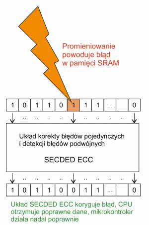 Poniżej znajduje się kilka przykładów wykorzystywanych w mikrokontrolerach mechanizmów. Rysunek 2 prezentuje obwód korekcji błędów pamięci ECC. Obwód SECDED pozwala na korekcję pojedynczego błędu (pojedynczego bitu) - SEC - lub detekcję błędów podwójnych - DED. Błędy w pamięci SRAM powstają np. na skutek promieniowania kosmicznego, bądź innych losowych zdarzeń, które są w stanie zmienić wartość jednej z komórek pamięci operacyjnej, powodując błędy w danych. System ECC pozwala na korekcję lub wykrywanie tych awarii.
