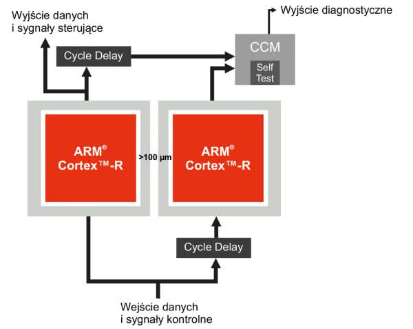 Na rysunku 3 zaprezentowano, wykorzystywany przez mikrokontrolery z rodziny TI Hercules układ dwóch rdzeni w architekturze nazwanej 1oo1D. Pozwala ona na eliminację wpływu błędów losowych na działanie systemu oraz bardzo ziarnistą diagnostykę procesora. Od klasycznej architektury 1oo1 układ ten odróżnia się posiadaniem dwóch równoległych rdzeni, których wyniki pracy porównywane są ze sobą przez specjalny moduł CCM, będący częścią układów diagnostycznych w mikrokontrolerze.