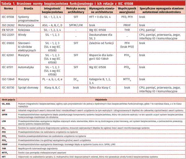 Pierwszą normą przeznaczoną do stosowania w szerokiej gamie systemów przemysłowych była IEC 61508, która została opublikowana w 1998 roku. W 2011 roku ukazała się motoryzacyjna norma bezpieczeństwa funkcjonalnego ISO 26262. Celem obu norm jest ustalenie wymagań, które zmniejszają potencjalne ryzyko obrażeń fizycznych czy uszczerbku na zdrowiu ludzi z powodu awarii danego produktu. Normy te wymagają wdrożenia ścisłego procesu rozwoju produktu, przeprowadzenia wstępnej analizy zagrożeń i ryzyka oraz wdrożenia zabiegów zmniejszających ryzyko, związane z produktem. Wykorzystuje się je zarówno w projekcie sprzętu, jak i jego oprogramowania. Normy te współdzielą wiele elementów, mają bardzo zbliżony cykl rozwoju produktu i wiele takich samych rozwiązań wspierających projektowanie. Istnieje jednak wiele innych, branżowych norm bezpieczeństwa, opierających się na tych dwóch normach. Są one zazwyczaj zgodne z IEC 61508, uzupełniając ją o dodatkowe wymagania architektoniczne czy obecność autotestu dla systemu w konkretnych zastosowaniach. W tabeli 1 zebrano podsumowanie różnych międzynarodowych norm bezpieczeństwa funkcjonalnego i ich związki z normą IEC 61508.