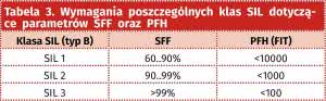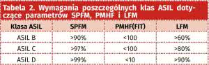 Przykłady zastosowania tych wskaźników przedstawiono w tabeli 2. Pokazuje ona wymagania dla poszczególnych klas ASIL (dla normy ISO 26262), dotyczące pojedynczego punktu uszkodzenia (SPFM), ukrytego wskaźnika uszkodzenia (LFM) i probabilistycznego opisu losowych awarii sprzętu (PMHF). Tabela 3 z kolei pokazuje wymagania normy IEC 61508 dla poszczególnych klas SIL (typ B) dla SFF przy tolerancji na awarię sprzętu (HFT) równej zero i dla prawdopodobieństwa awarii na godzinę (PFH).