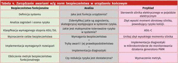 Zgodnie z normą ISO 26262, analiza zagrożeń opiera się na ocenie każdej z awarii w trzech kategoriach - poważności (S1...S3), prawdopodobieństwa niebezpiecznego wydarzenia w czasie awarii (E1...E4) oraz sterowalności sytuacją w danej awarii (C1...C3). W opisanym powyżej przypadku awaria klasyfikowana jest jako S3, ponieważ zagraża życiu; E4, ponieważ istnieje duże ryzyko, że auto w czasie awarii poruszać będzie się po autostradzie, drodze sąsiadującej z rowem melioracyjnym itp, oraz jako C2, ponieważ pomimo tego rodzaju awarii, autem można nadal kierować i hamować. Na podstawie tych klasyfikacji z normy można odczytać, iż system bezpieczeństwa funkcjonalnego musi mieć klasyfikację co najmniej ASIL-C, aby ryzyko było na tolerowanym poziomie. W tabeli 2 odczytać możemy towarzyszące tej klasie bezpieczeństwa metryki bezpieczeństwa - SPFM, PMHF (FIT) oraz LFM, które omawialiśmy we wcześniejszej części tekstu.W tabeli 4 zaprezentowano schematyczne przedstawienie postępowania, wraz z przykładowym zadaniem - sterownikiem silnika elektrycznego, zgodnego z normą ISO 26262. Podobne metody będą miały zastosowanie również w przypadku innych norm bezpieczeństwa funkcjonalnego. W przykładzie tym mamy do czynienia ze sterownikiem silnika w pojeździe elektrycznym. Jego głównym zadaniem jest kontrola momentu obrotowego silnika za pomocą przebiegu PWM. Moduł taki ma bardzo kompleksowe tryby awarii. Jednym z nich jest wygenerowanie zbyt dużego momentu obrotowego na silniku, co przełożyć może się na wywołanie wypadku komunikacyjnego - uderzenia w barierkę na autostradzie, zjechanie do rowu etc. Rozważmy ten przypadek dokładniej, gdyż jest on bardzo poważnym zagrożeniem dla zdrowia i życia kierowcy oraz pasażerów.