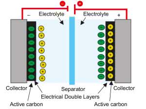 Aby zapobiec wewnętrznemu zwarciu między elektrodami, rozdziela się je separatorem, który jednak nie pełni funkcji klasycznego dielektryka. Separator nie blokuje też przepływu jonów w elektrolicie po przyłożeniu napięcia do elektrod. Funkcję dielektryka pełnią obszary styku elektrolitu i elektrody, które dzięki porowatości materiału umożliwiają uzyskanie ponadprzeciętnej pojemności. Schematyczną budowę superkondensatora EDLC pokazano na rysunku 2, a zasadę działania na rysunku 3. Dzięki brakowi reakcji chemicznych nie następuje degradacja elektrod, możliwe jest więc uzyskanie wysokiej trwałości i dużej liczby cykli ładowania i rozładowania.