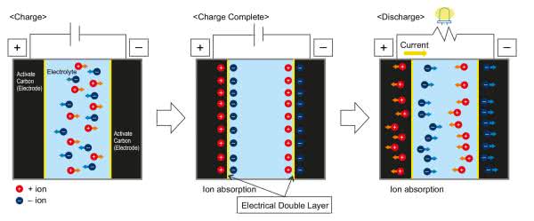 Najpowszechniej spotykane są superkondensatory EDLC (Electrical Double Layer Capacitor), w których ładunek przechowywany jest elektrostatycznie, a zasada działania nie wymaga procesów chemicznych (jak w bateriach lub akumulatorach), a jedynie gromadzenia i przepływu ładunków elektrycznych. Funkcję okładzin przejmują dwie identyczne porowate elektrody. Najczęściej są wykonane z węgla aktywnego, mogą mieć postać żelu, nanorurek węglowych lub grafenu, istotne jest, by miały dużą powierzchnię i niską rezystancję.