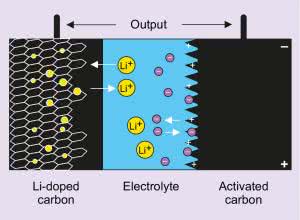 Kondensatory hybrydowe charakteryzują się zwiększoną gęstością energii osiągniętą bez znaczącej utraty trwałości w porównaniu z pseudokondensatorami i niskim samorozładowaniem w odniesieniu do technologii EDLC. Reprezentantami technologii hybrydowej są kondensatory litowe LIC. Zbudowane są asymetrycznie, jedna z elektrod domieszkowana jest litem, druga tak jak w EDLC wykonana jest z węgla aktywowanego. Schematyczną budowę kondensatora hybrydowego w technologii LIC pokazano na rysunku 4. Budową i cechami są bardziej podobne do ogniw (baterii) litowych LIB niż do klasycznym kondensatorów. Hybrydowe kondensatory litowe mają wyższe dopuszczalne napięcie pracy - 3,8 V (max. 4,2 V).
