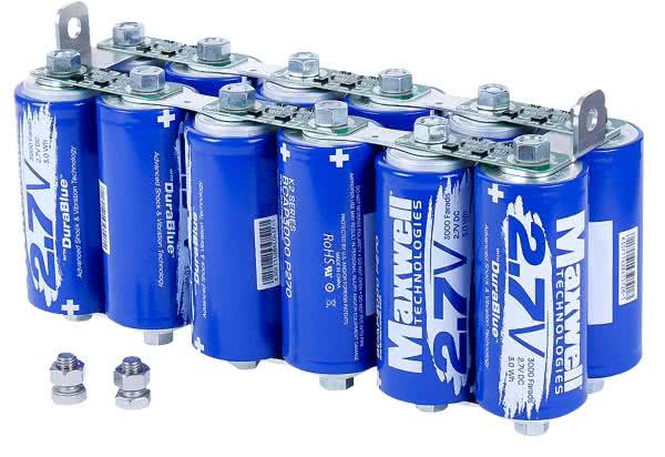 Do aplikacji wymagających samodzielnego zestawiania pakietów o dużych gromadzonych energiach dostępne są kondensatory z wyprowadzeniami osiowymi z gwintem M12, przystosowanymi do przewodzenia prądów rzędu kA (Maxwell Durablue) lub wyprowadzeniami przeznaczonymi do zgrzewania (Maxwell BCAPxxxxP270K05). Dla tych typów dostępne są akcesoria w postaci mostków prądowych o odpowiednio niskiej rezystancji, zapewniających nie tylko połączenie elektryczne, ale też mechaniczne pakietu oraz balansery dla współpracującej pary kondensatorów. Pakiet kondensatorów Maxwell Durablue z akcesoriami pokazano na fotografii 9.
