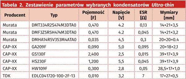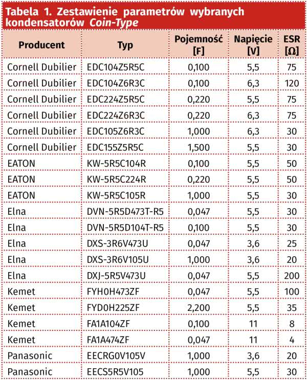 W przypadku tego typu superkondensatorów należy także sprawdzić zastosowanie, gdyż część z nich jest optymalizowana dla aplikacji o niewielkim ciągłym poborze mocy takich jak np. podtrzymanie pamięci RAM lub zegara RTC i ma względnie dużą rezystancję wewnętrzną (Elna Dynacap DXJ, DHL), w przeciwieństwie do standardowych wykonań przystosowanych do pracy cyklicznej o niskiej rezystancji szeregowej ESR (Elna Dynacap DZN, DU). Superkondensatorów nie należy używać do filtracji i odsprzęgania zasilania, gdyż ze względu na wysoką wartość ESR mogą ulec przegrzaniu i nieodwracalnemu uszkodzeniu. W tym wykonaniu dostępne są też stosy kondensatorowe o wyższym napięciu pracy uzyskanym poprzez szeregowe łączenie kondensatorów o niższym napięciu pracy. Typowe napięcia pracy to 3,6 V, 5,5 V, spotykane są też stosy 11 V (Kemet FA1A). Tak wykonane kondensatory nie mają wyprowadzeń balansowania, wewnętrzne kondensatory dobierane są przez producenta i mają zbliżone przechowywane ładunki lub stosowany jest prosty dzielnik rezystorowy wyrównujący napięcia na kondensatorach. Niewielkie moce, z jakimi są ładowane i rozładowane, nie wymagają złożonych układów ładowarek, a ładowanie sprowadza się do doboru rezystora ograniczającego prąd ładowania i diody zapobiegającej przepływowi wstecznemu prądu po zaniku zasilania. Polecam ten typ superkondensatora do eliminacji baterii litowych w układach podtrzymania RTC. Szczególnie w aplikacjach w których istnieje realne wymaganie pracy w szerokim zakresie temperatur, z naciskiem na temperatury ujemne (np. wymogi cold-start), gdzie typowe baterie litowe ulegają degradacji, a wersje z rozszerzonym zakresem temperatur (-40 do +85°C), takie jak np. Murata CR2032X, nie są łatwo dostępne, mają ceny porównywalne z superkondensatorami, nie wspominając o problemach z transportem i komplikacjach w montażu PCB. Porównanie kilku rodzin kondensatorów Coin-Type pokazano w tabeli 1.