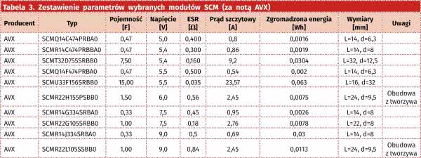 Moduły oferują pojemności do kilku faradów. Występują w wersjach z dopuszczalnym napięciem 5,4/5,0 V, 6,0/5,5 V, 7,5 V, 9/8,1 V, zwalniając konstruktora od konieczności zapewnienia balansowania ładunku, a zakres dostępnych napięć ułatwia dobór modelu pod konkretne zastosowanie. Zestawienie przykładowo wybranych modułów pokazano w tabeli 3.