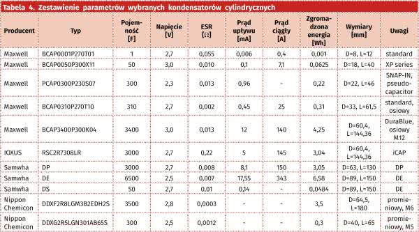 Zestawienie cech wybranych kondensatorów cylindrycznych prezentuje tabela 4.