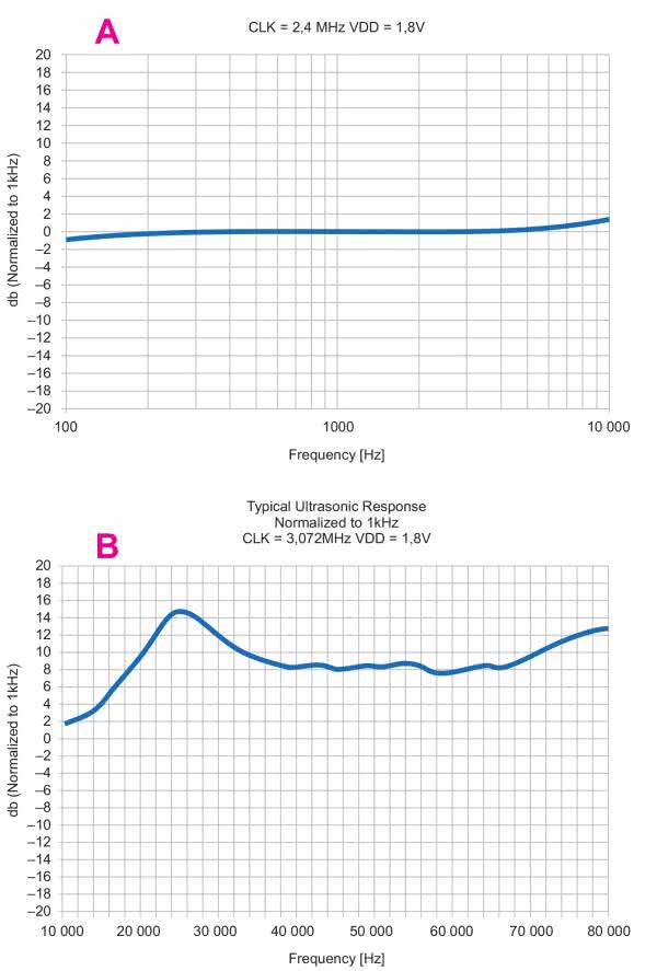 Mikrofony MEMS charakteryzują się ponadto szerokim pasmem akustycznym, często wchodzącym nawet w zakres ultradźwięków. Niektóre mikrofony, np. SPH0641LU4H-1 mają dwa tryby: jeden normalny obejmujący zakres akustyczny i drugi przeznaczony dla zakresu ultradźwiękowego. Charakterystyki częstotliwościowe tego mikrofonu pokazano na rysunku 5. Decydując się na zakup mikrofonu MEMS należy zwrócić uwagę na to czy ma on wyjście analogowe czy cyfrowe, pamiętając oczywiście o innych parametrach technicznych. Typowa czułość jest na poziomie –26 dBFS, zaś dynamika (odstęp sygnału od szumu) to około 61...65 dB.