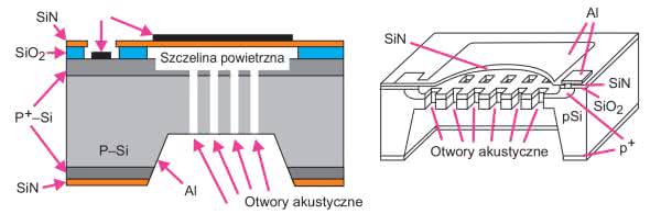 Z roku na rok notowany jest wzrost zapotrzebowania na elementy MEMS dla aplikacji konsumenckich. Jednym z największych odbiorców jest branża telekomunikacyjna. Podzespoły wykonane w technologii MEMS zastępują te, które były dotychczas produkowane technologiami tradycyjnymi. Dzięki temu zmniejszana jest powierzchnia na płytce obwodu drukowanego wymagana do realizacji określonych zadań. Dobrym przykładem są mikrofony MEMS wykazujące pod wieloma względami przewagę nad najczęściej stosowanymi mikrofonami elektretowymi. Przykładową konstrukcję przedstawiono na rysunku 4.