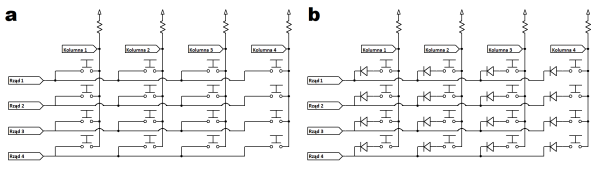 Definiując układ klawiszy trzeba pamiętać także o schemacie połączeń elektrycznych. Najczęściej stosuje się matrycowy układ klawiszy – są one połączone w kolumny i rzędy, a układ sterujący klawiaturą (np. mikrokontroler lub dedykowany kontroler klawiatury) przemiata np. rzędy i odczytuje wartości z kolumn. Na podstawie tego system wykrywa, jaki klawisz został naciśnięty. Typowy układ matrycowy pokazano na rysunku 1. Warto zwrócić uwagę, że występuje on w dwóch konfiguracjach – bez diod (rysunek 1a) oraz z diodami (rysunek 1b). Zastosowanie diod pozwala systemowi działać poprawnie w momencie, gdy naciśniętych jest kilka klawiszy.