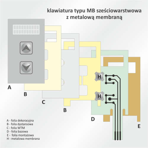 Jednym z najprostszych i najtańszych mechanizmów klawiatur jest rozwiązanie z użyciem membrany. Klawiatury takie, zwane czasami klawiaturami foliowymi, zbudowane są z odpowiednio uformowanych, laminowanych warstw z tworzyw sztucznych. Przykładowa konstrukcja tego rodzaju klawiatury została pokazana na rysunku 2.