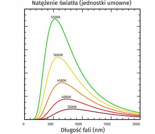 Na rysunku 1 pokazano widmo promieniowania elektromagnetycznego dla różnych temperatur. Można zaobserwować, że w sposób spójny maksimum tego widma przesuwa się w stronę wyższych energii wraz ze wzrostem temperatury. Zasadę tę można stosować również do pomiaru temperatury ludzkiego ciała. Przy temperaturze 36,6°C (309,75 K) maksimum emisji ciała doskonale czarnego przypada na 9,36 µm, czyli w zakresie średniej podczerwieni. Mierząc zmianę intensywności promieniowania podczerwonego w znanym, ściśle określonym zakresie temperatur możliwe jest oszacowanie temperatury mierzonego przedmiotu.
