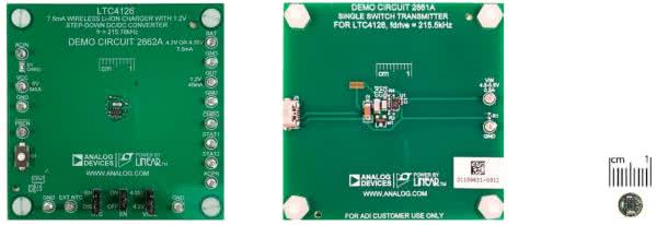 LTC4126 jest bliźniaczą wersją LCT4126-10, ze zmniejszonym do 7,5 mA prądem ładowania i możliwością współpracy z akumulatorem LiIon o napięciu 4,2 V lub 4,35 V. Zwiększony został do 360 minut maksymalny czas ładowania. Dla układu LTC4126 dostępne są zestawy uruchomieniowe EVAL-DC2663A-KIT, zawierające płytkę odbiornika DC2662A, nadajnika DC2661A oraz dwa moduły aplikacyjne DC2687A. Wygląd zestawu pokazano na fotografii 1.
