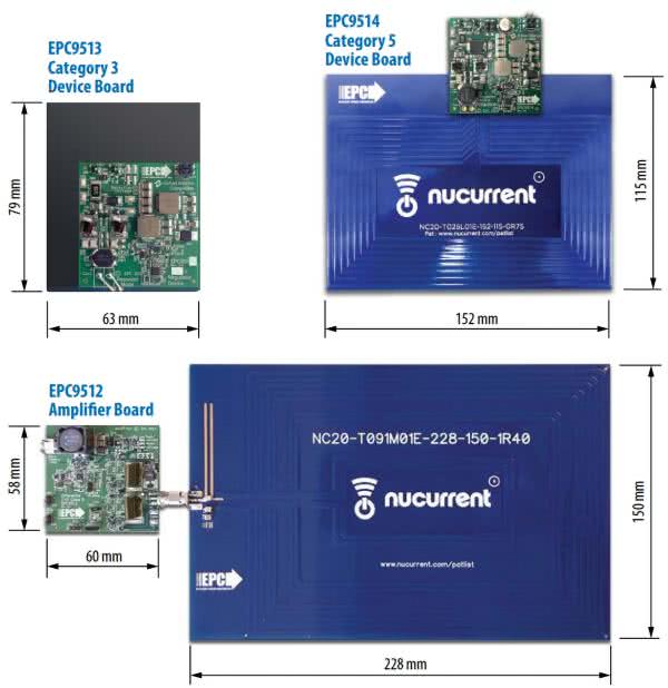 Zestaw EPC9129 (fotografia 7) składa się z płytki wzmacniacza EPC9512 o mocy do 33 W, cewki nadawczej (Cat4), odbiornika EPC9513 (Cat3) – dostarczającego 5 V/5 W dla aplikacji mniejszej mocy (np. smartfony), IoT oraz odbiornika EPC9514 (Cat 5), dostarczającego 19 V/27 W dla aplikacji średniej mocy, takich jak bezprzewodowe ładowanie laptopów.