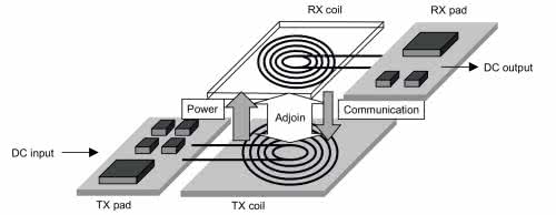- Sprzężone magnetycznie cewki nadawcza (TX coil) i odbiorcza (RX coil) – pomiędzy którymi, dzięki sprzężeniu magnetycznemu, następuje transfer energii z nadajnika do odbiornika. W zależności od założonego sposobu sprzężenia cewek, wyróżnia się dwa sposoby przekazu: pierwszy, czyli indukcyjny (MI Magnetic Induction), bazujący na silnym sprzężeniu cewek Rx/Tx; drugi, czyli bazujący na słabym sprzęgnięciu i wykorzystaniu rezonansu magnetycznego (MR Magnetic Resonance).