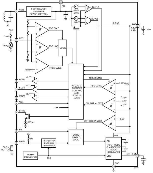 Najprostszy z rodziny LTC4126-10 jest kompletnym układem zasilania dla urządzeń IoT lub urządzeń audio, takich jak aparaty słuchowe, słuchawki bezprzewodowe itp. Strukturę wewnętrzną układu pokazano na rysunku 2. Układ integruje ładowarkę bezprzewodową LiIon o ustalonym prądzie ładowania 10 mA i wybieranym sprzętowo napięciu akumulatora 4,1 lub 4,2 V. Ładowanie może być nadzorowane termistorem NTC, a akumulator zabezpieczony jest przed nadmiernym rozładowaniem wbudowanym układem odcinającym. Przed przeładowaniem akumulatora zabezpiecza układ timera, z ustalonym na 180 minut czasem ładowania. Napięcie z akumulatora obniżane jest w pompie ładunkowej do wartości 1,2 V, przy maksymalnym obciążeniu 60 mA. Pompa posiada wbudowane kondensatory, co znacząco zmniejsza zajmowaną przez elementy powierzchnię.