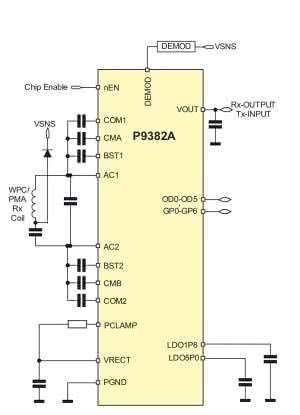 Ciekawą propozycją są układy P9382A firmy Renesas (IDT), zdolne do dwukierunkowej (TRx) transmisji energii. W trybie nadajnika układ jest w stanie dostarczyć do 6 W, a w trybie odbiornika odebrać 20 W mocy. P9382A jest implementacją rdzenia CortexM0 i specjalizowanych peryferiów. Struktura zamykana jest w obudowie DSBGA53 o rozmiarach 4×2,8 mm. Wbudowana pamięć nieulotna pozwala na wielokrotną konfigurację. Układ jest zgodny z WPC1.2.4. Typową aplikację pokazuje rysunek 5.