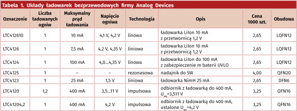 Pierwsza w kolejności grupa układów i zestawów uruchomieniowych, bez określonego standardu wymiany danych, doskonale reprezentowana jest przez rozwiązania firmy Analog Devices. W tabeli 1 pokazano aktualnie produkowane układy ładowarek bezprzewodowych.