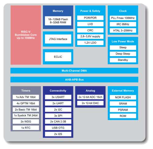 32-bitowy chip działa z częstotliwością 108 MHz i ma zwykły zestaw mikrourządzeń peryferyjnych. Obejmuje to wiele timerów, UART, SPI, I2C, I2S i zewnętrzny kontroler pamięci. Dołączone są podwójne kontrolery CAN 2.0B i kontroler USB 2.0 OTG. Istnieje również mieszanka 16-to i 24-bitowych timerów RISC-V, a GigaDevice dodaje 64-bitowy zegar czasu rzeczywistego. Analogowe urządzenia peryferyjne obejmują: przetwornik ADC 1 Msample/s; podwójne 12-bitowe, 16-kanałowe przetworniki ADC; podwójne 12-bitowe przetworniki DAC. Dostępne są wersje z maksymalnie 80 GPIO.